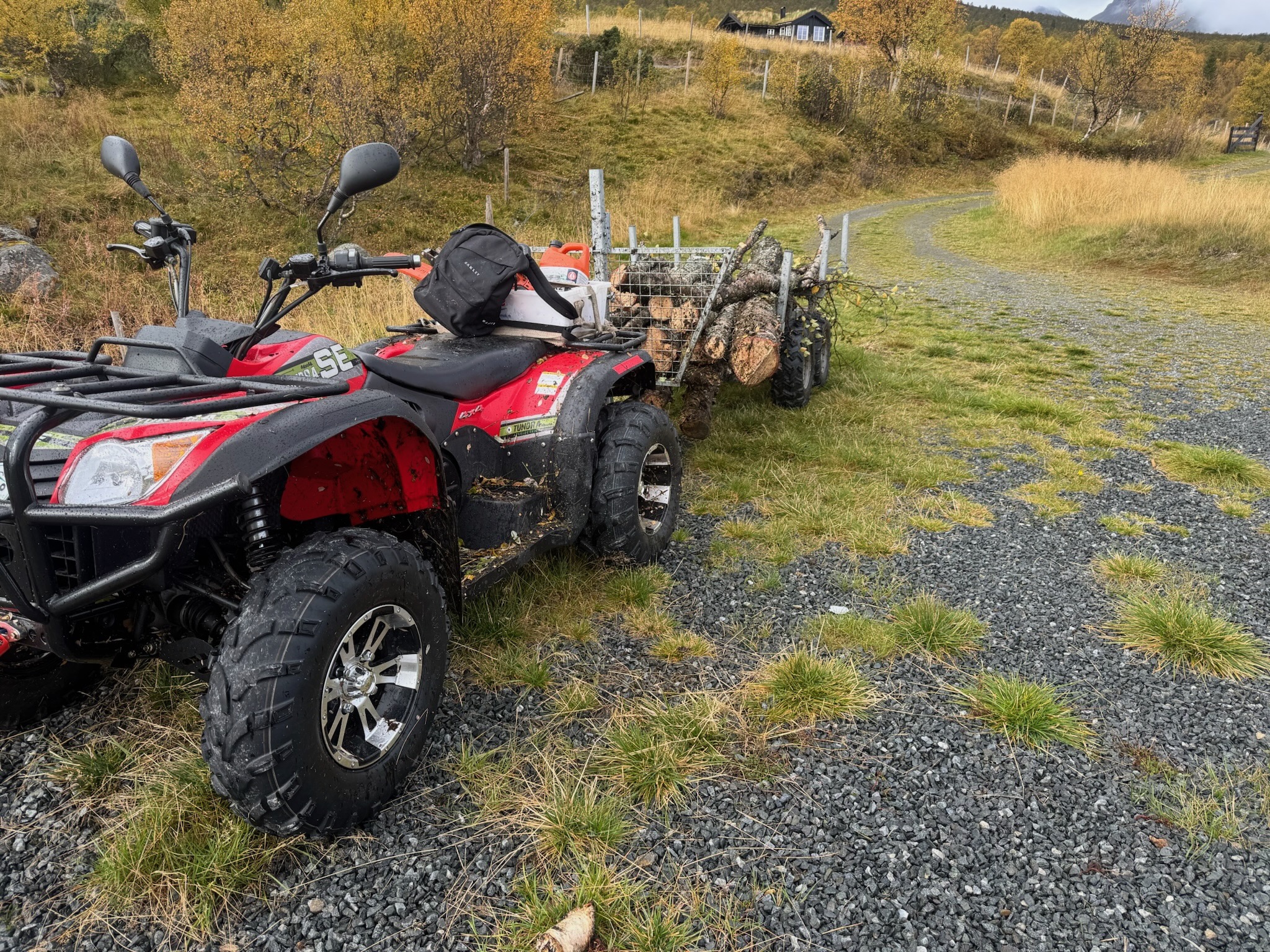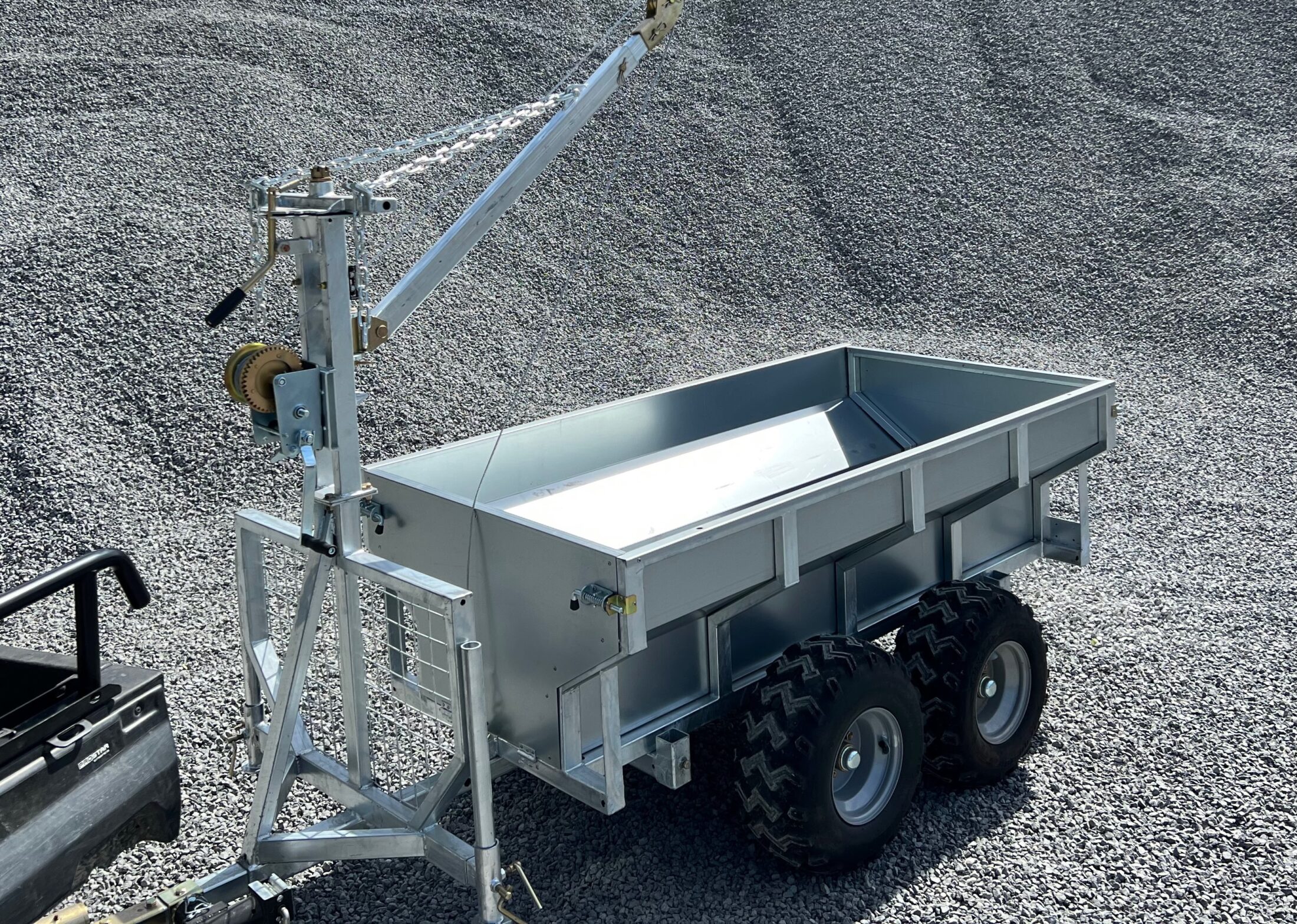 Her får dere en pakke med en multihenger og elektrisk ATV, klar til bruk i skogen.
